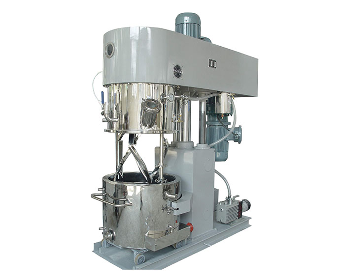 雙行星混合攪拌機由減速電(diàn)機、封蓋(gài)、行星架、攪拌器、刮(guā)壁器、料桶(tǒng)、雙柱液壓升降係統、真空係統以及機架等構成特點如下: